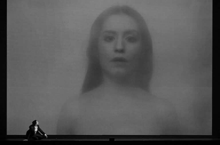 C’est toutefois la mise en scène de Shirin Neshat qui constitue le véritable centre critique du spectacle. La metteuse en scène de l’Aida salzbourgeoise récemment reprise à Paris, ici à sa seconde expérience lyrique, crée un spectacle entièrement joué en noir et blanc, construisant un dualisme constant entre quotidien et subconscient, réalité et aliénation, avec des échos évidents de Strindberg et de Bergman. Avant même que la musique ne commence, dans le silence — toujours périlleux, mais ici parfaitement maîtrisé —, la tragédie se devine : Eurydice s’est donné la mort après la perte d’un enfant. Dès lors, tout ce qui suit devient un long et douloureux auto-procès d’Orphée, une crise existentielle prenant la forme d’un thriller intérieur.