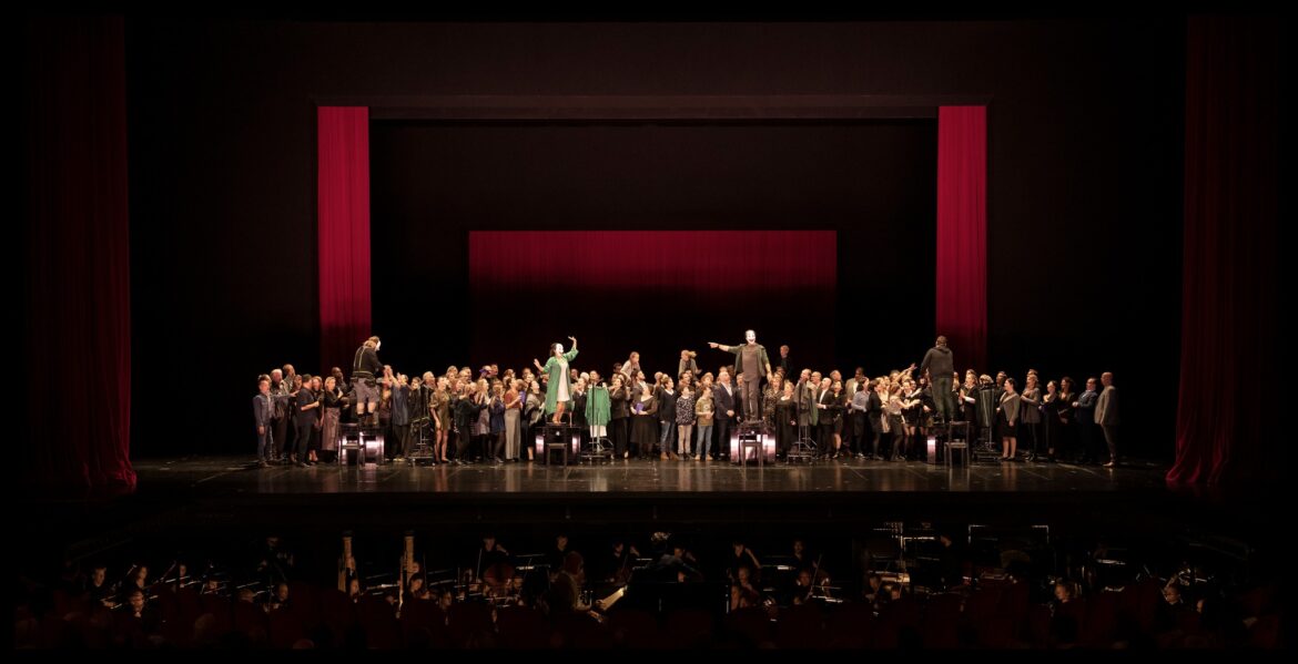 Finito il prologo di Pagliacci, la prima sorpresa: il Coro del Maggio si alza dalle due prime file della platea, mentre il Coro di voci bianche dell’Accademia del Maggio scende a precipizio dal fondo della sala verso il palco: il pubblico è dentro lo spettacolo, idea in sé non nuova, ma realizzata con grande maestria.