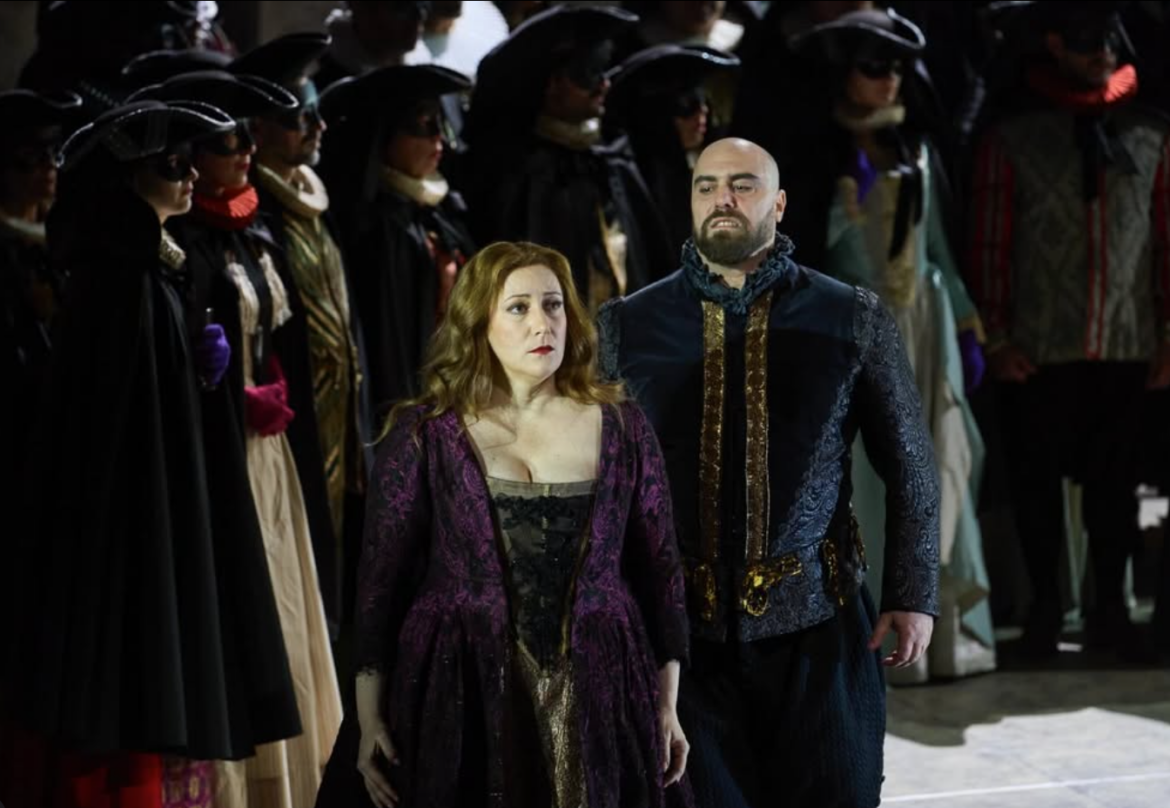 Ksenia Dudnikova, qui incarne Laura, figure d’une noblesse contrainte, bénéficie d’une présence scénique élégante. La ligne vocale demeure globalement soignée, bien que certains passages aigus laissent apparaître une tension passagère, comme si la fragilité du personnage affleurait jusque dans l’émission. Quant à John Relyea, son Alvise impose une autorité naturelle. La projection, parfois couverte par un orchestre généreux, pourrait gagner en netteté, mais le charisme et la profondeur du grave traduisent efficacement cette violence institutionnelle, feutrée puis implacable. Ce couple est fort bien mis en valeur par les costumes de Christian Lacroix, particulièrement structurés et richement ornés, qui affirment avec clarté leur rang social.