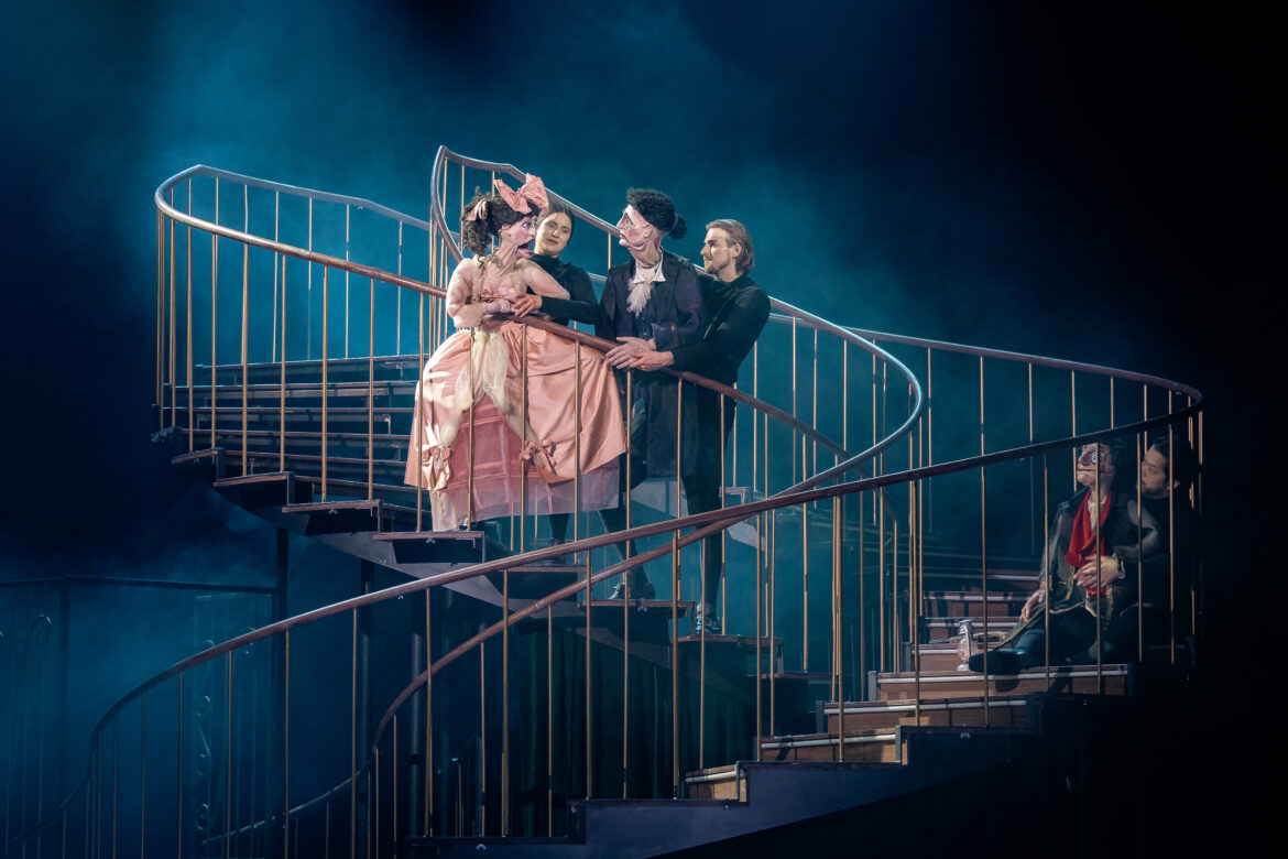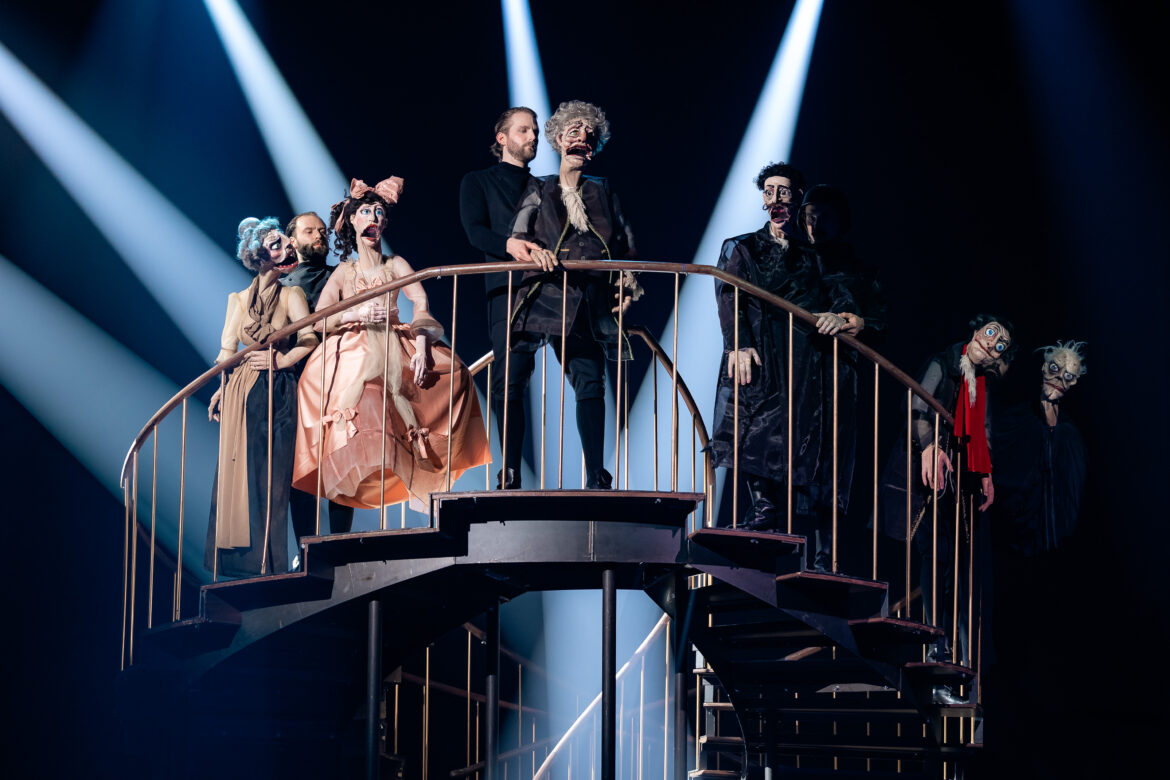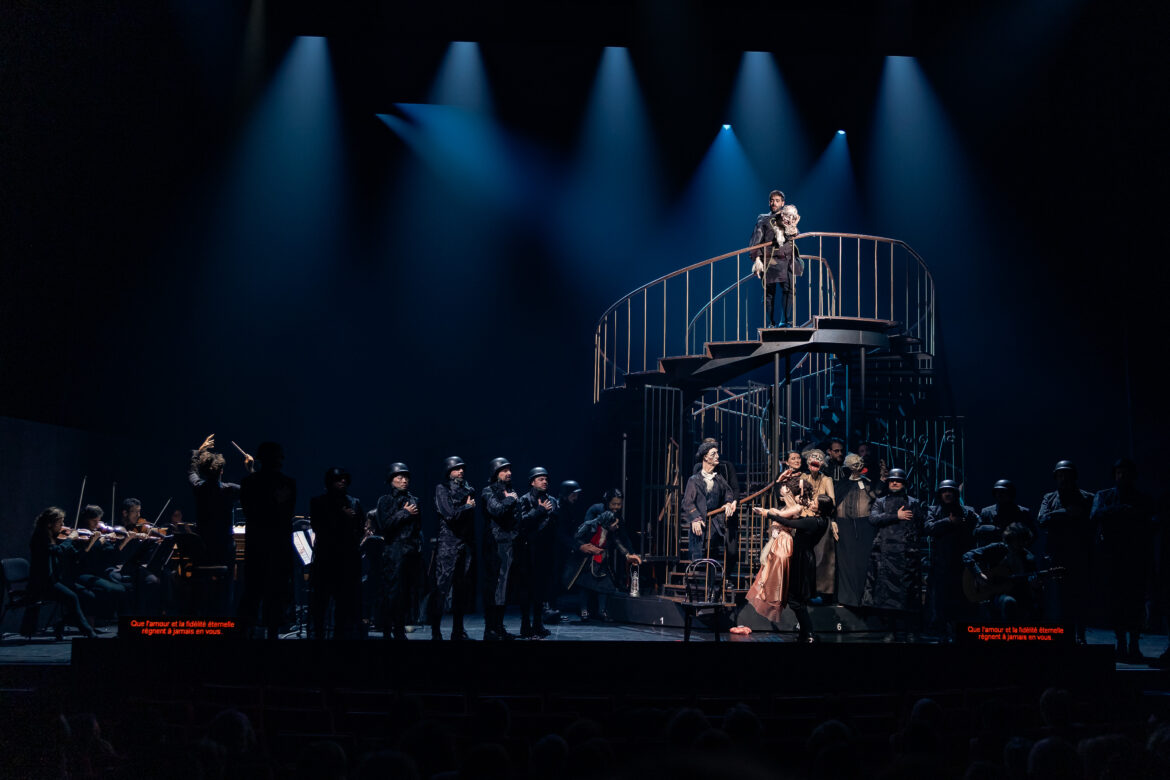 Le metteur en scène Nikolaus Habjan pose tout à découvert. Le plateau est une table de travail. Un grand escalier en spirale, sombre, métallisé, et ses rampes qui accrochent la lumière – signée Vassilios Chassapakis – comme des lames. Peu d’objets. De l’air. Une pénombre bleue qui sculpte l’espace au lieu de l’illuminer. Et, surtout, une contrainte devenue un partage décisif : l’orchestre n’est pas dessous, il est là, à vue, exposé avec les chanteurs, placé sur le plateau comme une force dramatique. La musique cesse d’être un tapis sonore. Elle devient un corps présent, un partenaire, une respiration visible. Mais l’idée majeure est ailleurs. Chaque personnage marche avec son double. Mais peut-être est-ce l’inverse ?