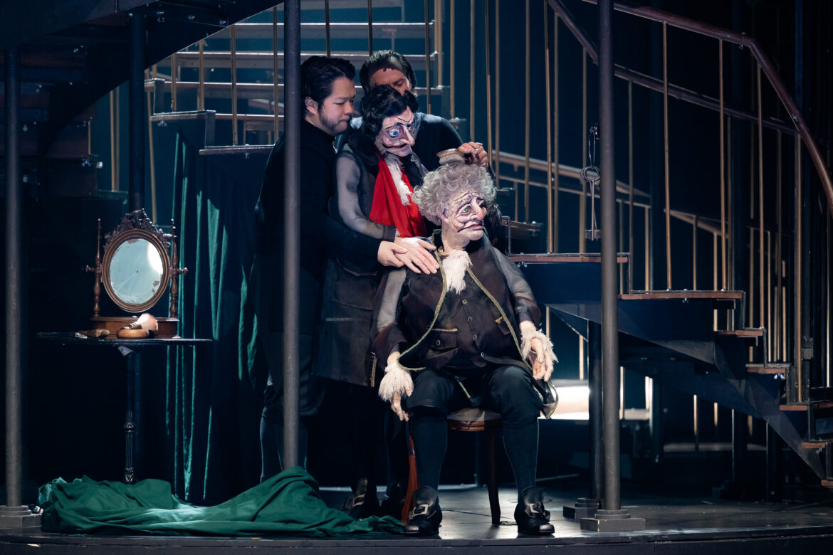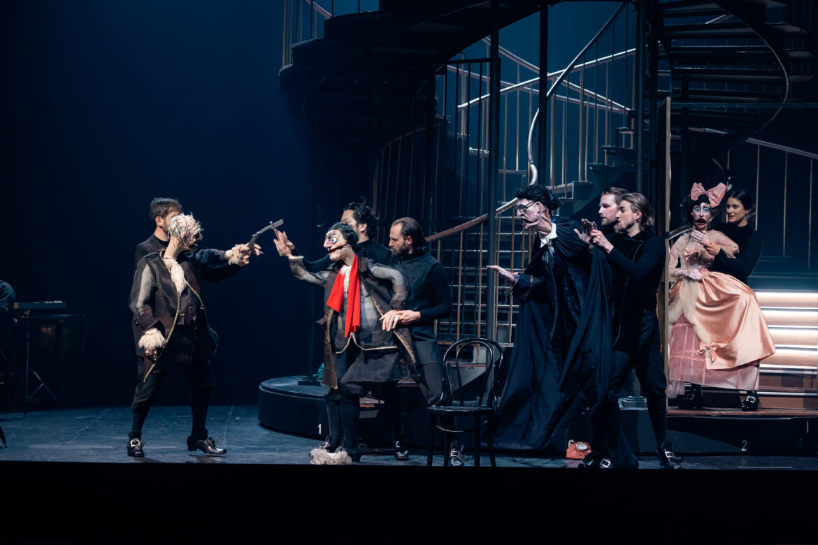 Et soudain, tout change dans la caractérisation, et même dans le chant. La marionnette n’est pas un gadget, elle est un amplificateur. Elle grossit le trait quand il faut faire rire. Elle durcit le visage quand il faut faire peur. Elle rend visible la violence contenue sous la bouffonnerie. Et, surtout, elle installe une question qui traverse la soirée comme un fil tendu : qui commande ? Le chanteur, la marionnette, la main, le regard du public ? Habjan ne donne pas une réponse, il fabrique une oscillation physique, ce renversement où le sujet change de côté, où le manipulateur se découvre presque en sujétion, comme s’il devait lutter pour ne pas être dominé par l’autre qui le prolonge. Cette tension devient splendide dans « Una voce poco fa ». Rosina et son double s’y répondent, se contredisent, se disputent presque la même énergie. La jeune femme, stratège et amoureuse impulsive, et la marionnette, enfant-fauve, instinctive, tranchante. Le bel canto n’est plus un luxe, il devient une arme. La colorature n’est plus une guirlande, elle devient une façon de saisir et de mordre. Et l’on comprend pourquoi la marionnette, objet de vision avant tout, trouble à ce point : elle attire l’œil, elle organise le regard, elle le fixe sur un manque, sur une pulsion, sur un point de désir.
