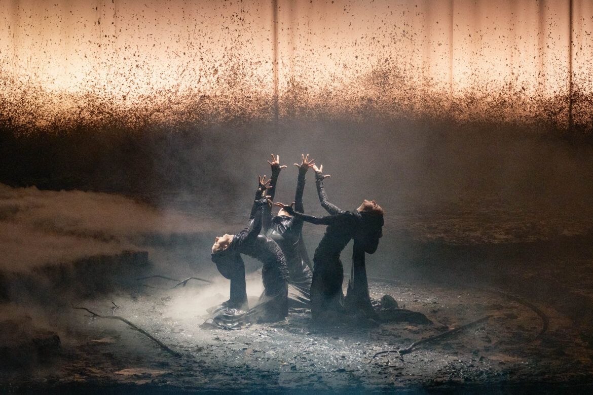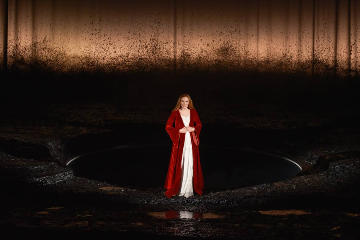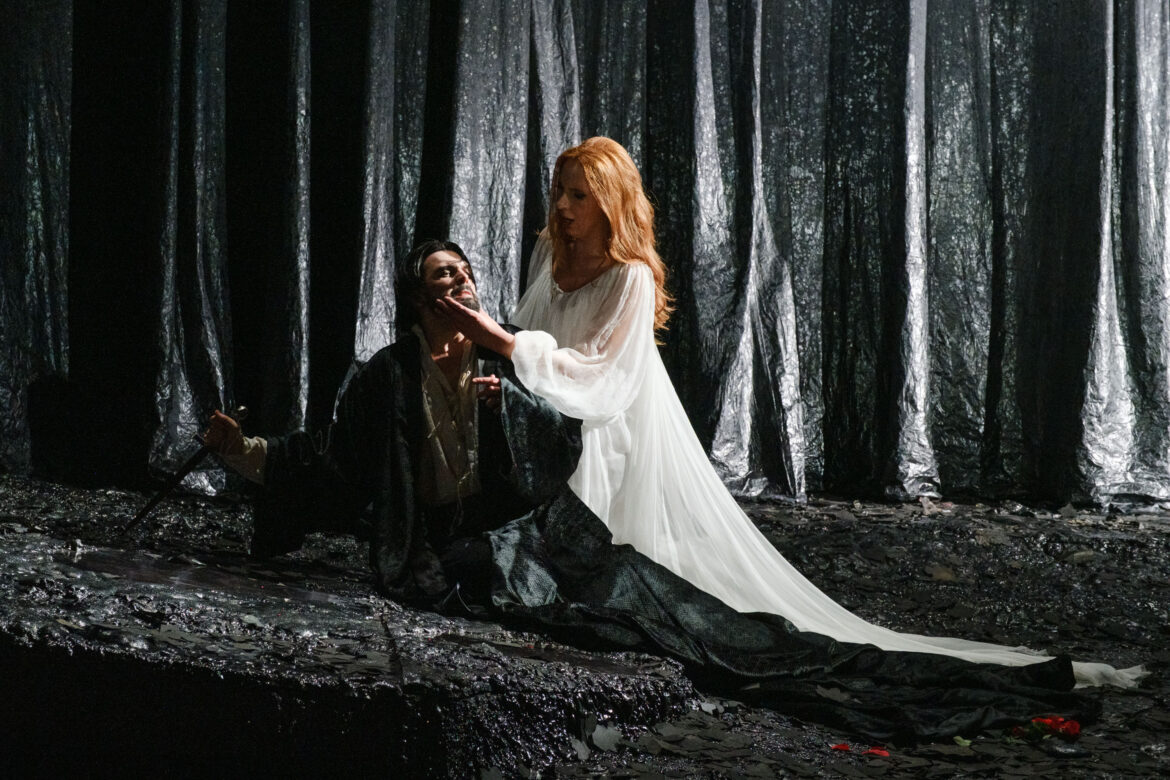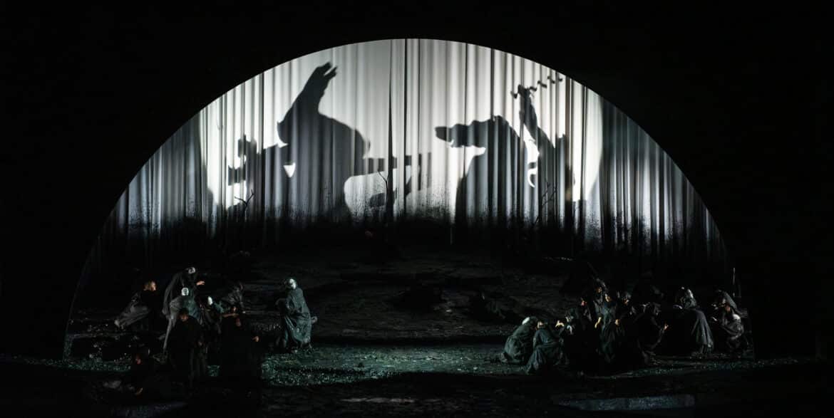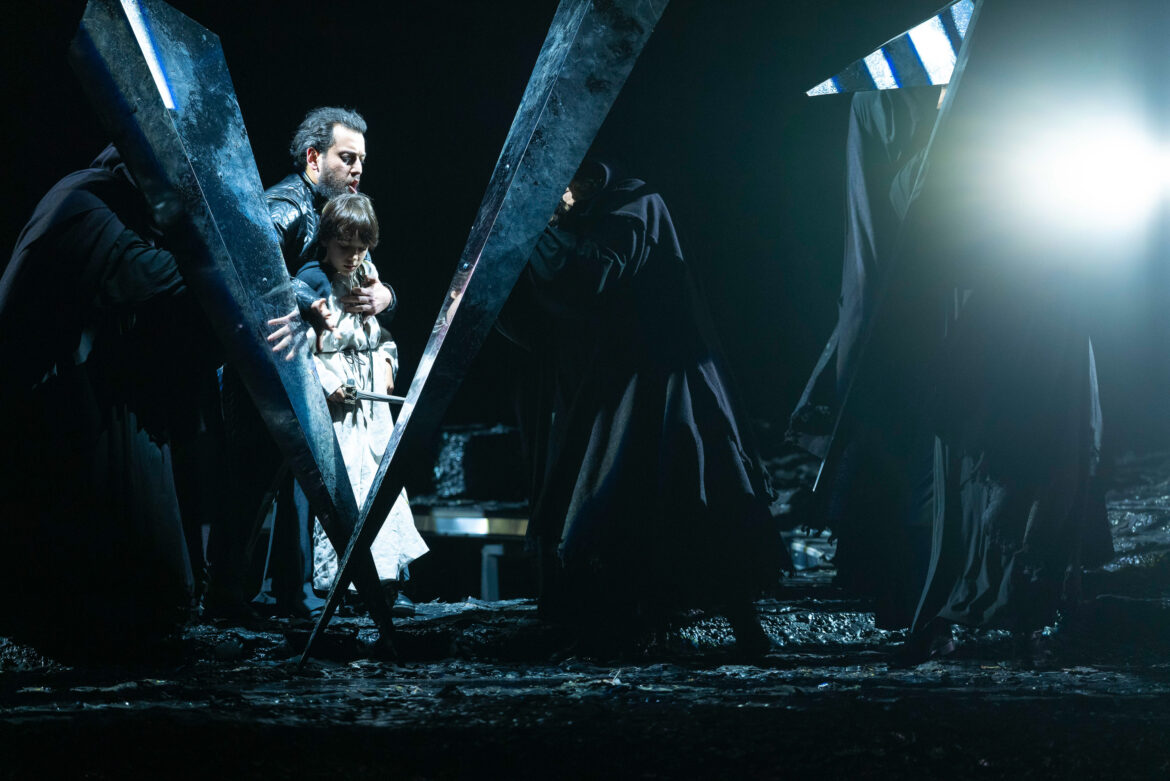La mise en scène de Chiara Muti apparaît quant à elle un peu inégale. Certains lui reprocheront son caractère davantage illustratif qu’interprétatif — ce qui pourra a contrario séduire les amateurs de lisibilité. On regrette parfois une gestuelle un peu trop académique, souvent calquée sur les accents musicaux, ainsi qu’un usage un peu appuyé des rideaux et tulles. La production n’en ménage pas moins de beaux moments : l’apparition spectrale de la reine dans la scène de somnambulisme, celle du fantôme de Banco, sobre et efficace, ou encore la scène de « théâtre dans le théâtre » de l’acte III, où Macbeth se livre à une véritable « comédie du pouvoir », écho anticipé à la célèbre méditation finale où la vie est comparée à « un fantôme errant, un pauvre comédien qui se pavane et s’agite durant son heure sur la scène et qu’ensuite on n’entend plus » (réplique reprise par Piave dans son livret à la scène 6 du dernier acte). La scénographie d’Alessandro Camera se révèle particulièrement habile : un décor quasi unique, dominé par un plan incliné suggérant la folie progressive des protagonistes et une forme circulaire centrale, tour à tour chaudron des sorcières, bouche sinistre d’où surgissent les oracles ou lit glacé d’un couple sans amour.