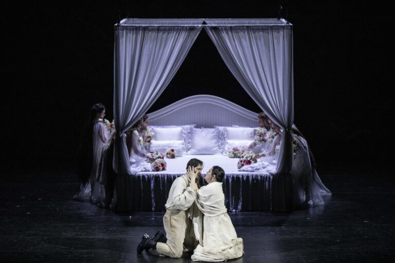 La lecture d’Emma Dante, pour linéaire et classique qu’elle soit, a le mérite de respecter l’esprit de l’œuvre en y apportant sa touche personnelle qui rappelle son idiosyncrasie théâtrale : elle se révèle dans les personnages à mi-chemin entre les puppi siciliens et les personnages espiègles de la commedia dell’Arte qui servent d’intermezzo muet entre le premier et deuxième actes ; costumes rouge flamboyant, jeux de miroirs qui annoncent l’ascension de l’héroïne dans l’acte parisien, ou encore, belle trouvaille, les filles fantômes (écho aux filles fleurs de Parsifal ?) qui déposent leurs bouquets autour de Manon comme une prière sur la tombe qui l’attend. Les lumières subtilement dosées de Christian Zuccaro permettent de transformer intelligemment le décor unique d’abord en une demeure bourgeoise (balcons dorés, rideaux rouges qui recouvrent les portes), à savoir le bel hôtel particulier de Géronte, teintée d’une suggestive couleur violette sombre qui se confond avec le rouge dominant, puis en prison dans le port du Havre (des portes grillagées ont remplacé les lourdes tentures pourpres), avant qu’il ne soit escamoté dans le dernier acte par un mur aux figures géométriques saillantes qui recouvre l’entièreté de la scène. Et si le grand lit blanc à baldaquin peut sembler superfétatoire, son aspect funèbre, dans sa blancheur aveuglante d’outre-tombe, rappelle celui rouge flamboyant du deuxième acte, symbole de la splendeur et de la réussite sociale de l’héroïne.