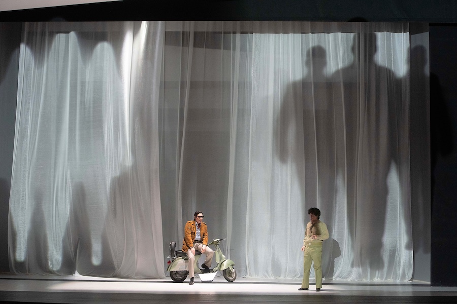 La mise en scène, signée Davide Livermore et Mercedes Martini, saisit avec précision ces ambivalences en construisant un espace scénique à la fois concret et mental. Sur scène évoluent plusieurs alter ego des protagonistes : deux Callas (la diva et la femme), quatre Pasolini (le poète, le réalisateur, le penseur, l’homme blessé). Une démultiplication qui donne à voir la fragmentation intérieure des personnages. Le Garçon évoque explicitement les traits et les manières de Ninetto Davoli, tandis que la figure de la Mère épouse les contours simples et concrets de Susanna Colussi.