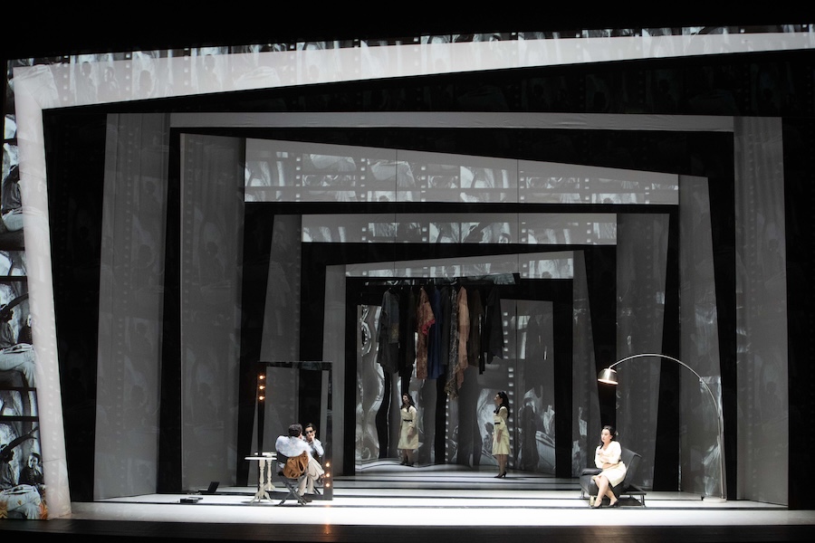 La scénographie d’Eleonora Peronetti reprend celle déjà appréciée pour Il lutto di addice ad Elettra, en créant un environnement presque abstrait. Les images, souvent filtrées et stratifiées, dialoguent avec la musique en en amplifiant les résonances. L’apport vidéo de D-Wok renonce à la spectaculaire digitalisation habituelle pour miser sur des photographies en noir et blanc : un fonds visuel qui devient mémoire partagée. Les costumes d’Anna Verde et les lumières d’Aldo Mantovani complètent un dispositif scénique cohérent, jamais envahissant.