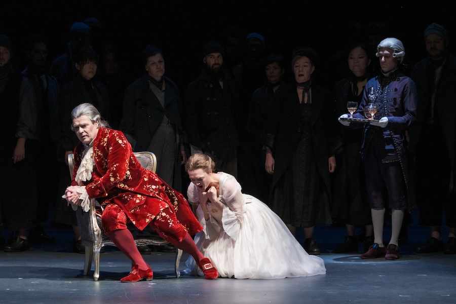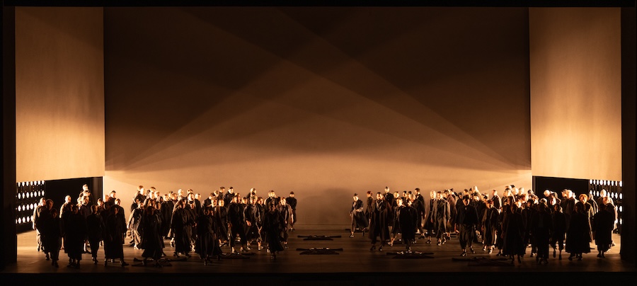 Carsen renonce délibérément à la reconstitution historique pour se concentrer sur le noyau spirituel du drame. Les figures collectives — religieuses, révolutionnaires, foule — sont disposées selon des géométries précises, créant des images d’une forte portée symbolique. Le rapport entre l’individu et la communauté, thème central de l’œuvre, se traduit ainsi en une dramaturgie de l’espace, où les corps deviennent architecture.