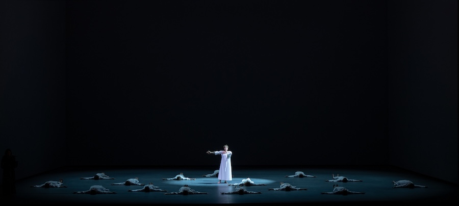 Mais c’est surtout la mise en scène de Robert Carsen qui marque les esprits. Reprise par Christophe Gayral, elle repose sur un principe d’essentialité radicale. Ce choix engendre une forme d’abstraction scénique : au lieu de reproduire de manière réaliste le couvent ou les lieux de la Révolution, Carsen construit un univers symbolique dans lequel les corps, les mouvements et la lumière deviennent les principaux outils dramaturgiques. Les décors de Michael Levine réduisent l’espace à une géométrie pure : trois murs, quelques objets, aucun goût pour l’ornement. Il en résulte un environnement abstrait, presque mental, où chaque élément devient signe.