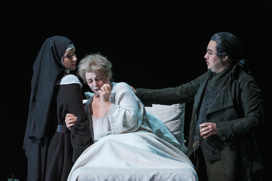L’autre figure clé de l’intrigue est la prieure du Carmel, Madame de Croissy, « vieille » de 59 ans – comme nous l’apprend Sœur Constance avec sa franchise désarmante : « Mais quoi, à cinquante-neuf ans n’est-il pas grand temps de mourir ? »… – malade et en proie aux doutes sur une foi jusqu’alors inébranlable. Il s’agit d’un moment que de grandes voix de l’art lyrique ont transformé en une scène inoubliable. Sylvie Brunet-Grupposo ne fait pas exception : voix de type Falcon et interprète de grand tempérament, dotée d’une forte présence scénique, elle rend le personnage physiquement et psychologiquement crédible, par son intensité dramatique et sa vérité émotionnelle.