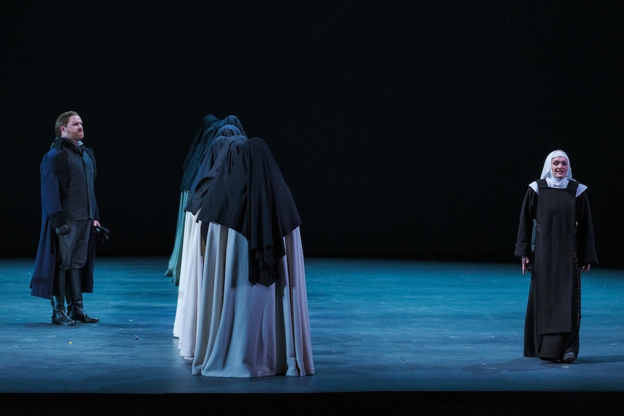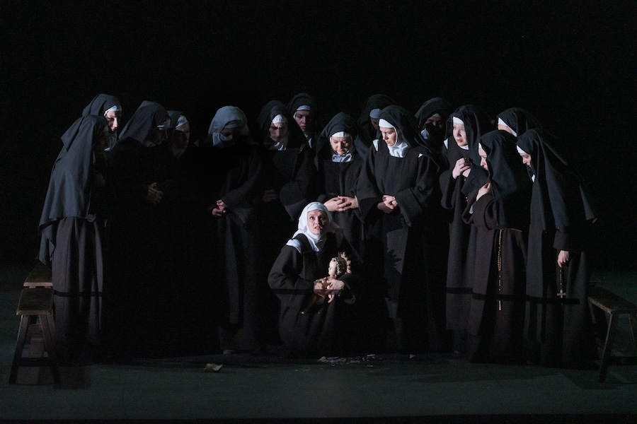De nombreux autres personnages, non moins importants, méritent d’être mentionnés, tous servis avec efficacité : les mezzo sopranos Antoinette Dennefeld (la sous-prieure Mère Marie de l’Incarnation) et Lorrie Garcia (la doyenne Jeanne de l’Enfant) ; les ténors Krystian Adam (l’aumônier) et Matthieu Justine (premier commissaire) ; les barytons Isaac Galán (le geôlier et second commissaire) et Roberto Accurso (un officier et le serviteur Thierry) ; ainsi que Martina Myskohkid (Sœur Mathilde) et Eduardo Martinez (le médecin Monsieur Javelinot), ces deux derniers appartenant au Regio Ensemble.