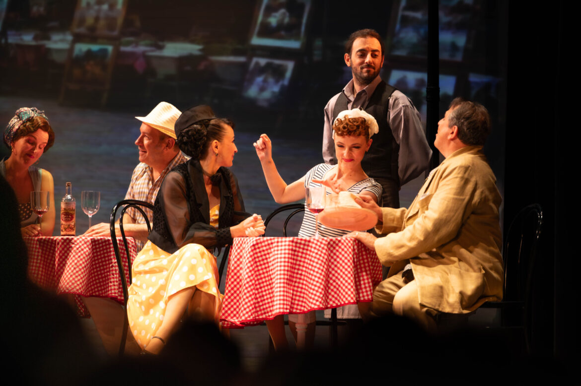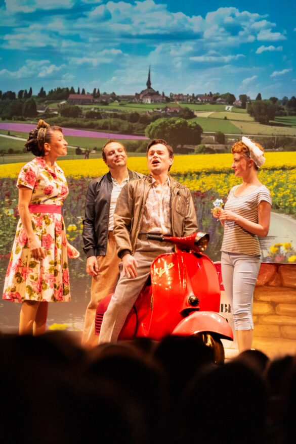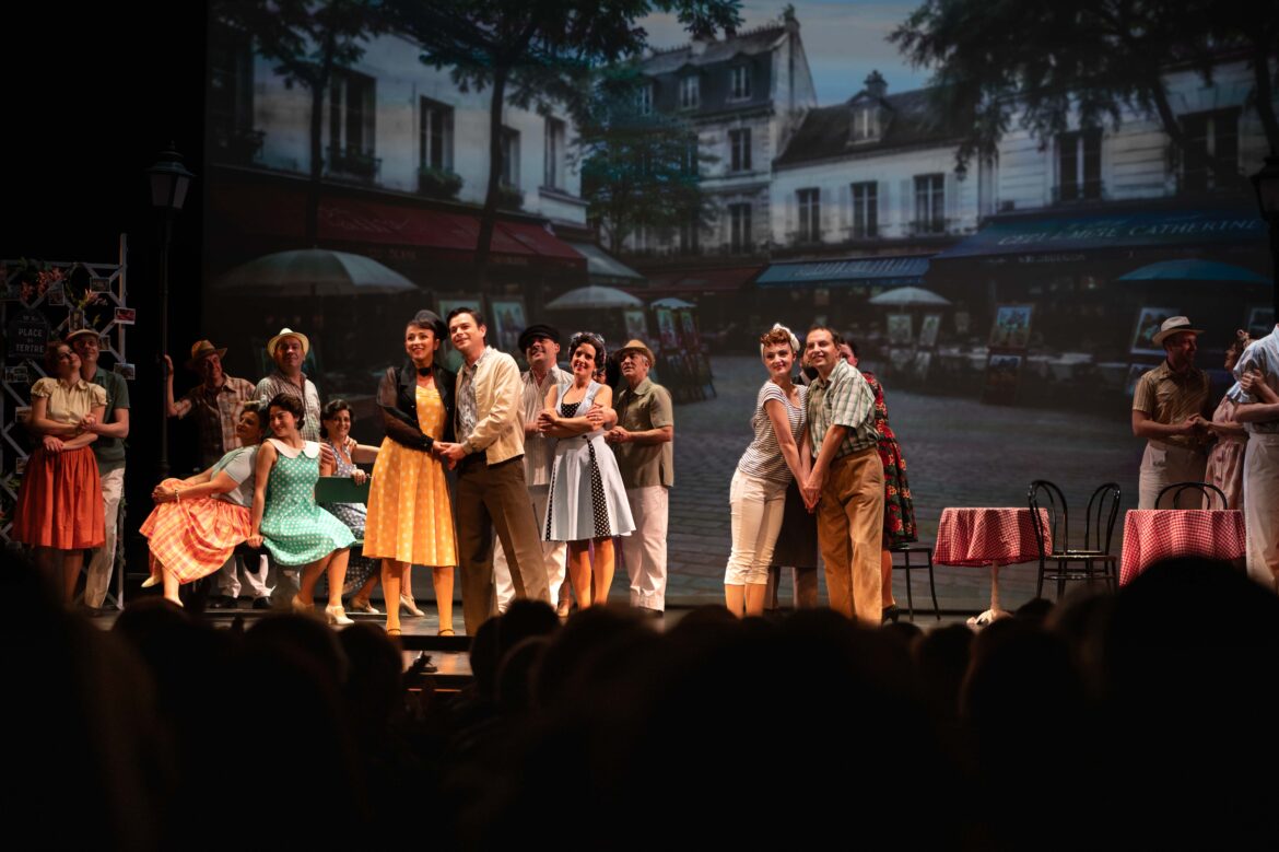 C’est une tradition à Marseille : très régulièrement, La Route fleurie est programmée au théâtre de l’Odéon pour le plus grand bonheur des spectateurs qui s’y précipitent en masse. Pour ces deux seules représentations, le théâtre affiche complet. Nous assistons à une nouvelle production de l’Odéon, haute en couleurs, avec des décors superbes (signés Loran Martinel) représentant la place du Tertre à Paris, les paysages de Provence, un joli mas, etc., sous la forme de toiles de fond sur lesquelles sont imprimées des photos immenses. On s’y croirait. La mise en scène enlevée est précise et efficace comme Carole Clin, qui signe la plupart des mises en scène de l’Odéon, nous y a habitués.