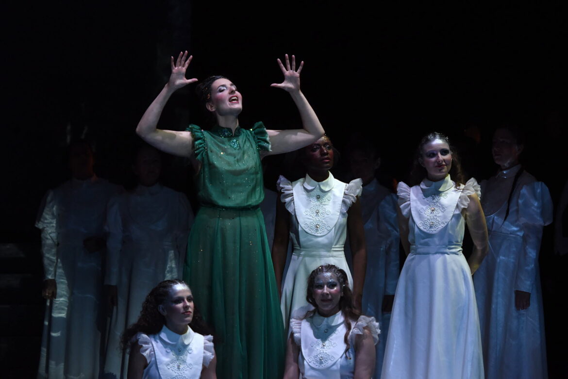 Cultivé, entre autres, par Offenbach (Le Roi Carotte) et Massenet (Cendrillon), l’opéra-féerie triomphe au XIXe siècle, qui bénéficie qui plus est des dernières avancées technologiques en matière de mise en scène. Charles Silver, élève de Massenet, en donne un des derniers avatars, représenté à Marseille en 1902, même si vingt plus tard Respighi en proposera encore sa propre version (La bella dormiente nel bosco), aux proportions toutefois moins ambitieuses. Si la princesse Aurore s’endort pendant cent ans, l’opéra de Silver a attendu cent vingt-quatre ans pour renaître scéniquement à l’opéra de Saint-Étienne, en même temps que sort l’enregistrement discographique sous l’égide du Palazzetto Bru Zane, mais avec une distribution presque entièrement renouvelée. Tout est à louer dans cette magnifique production, à commencer par la mise en scène de Laurent Delvert, d’une efficace et intelligente sobriété. Les décors intemporels de Zoé Pautet qui montre des praticables couleur béton (clin d’œil à l’architecture du Grand-Théâtre-Massenet ?), un escalier latéral conduisant à un balcon d’où perce une porte, suggérant les éléments d’un château, des rideaux verts et des néons évoquant l’inquiétante étrangeté de la forêt, les lumières changeantes de Nathalie Perrier, contribuent à la féérie de l’ensemble, avec un sens remarquable de la dramaturgie dont le prologue (Le baptême), où l’on passe de la joie festive à la prophétie terrifiante, concentre tous les atouts. Si les formes closes ne manquent pas, l’opéra de Silver s’inscrit dans la tradition lyrique française qui fait la part belle à la noble déclamation et au raffinement orchestral (les pages symphoniques, ouverture, préludes, danses, y sont particulièrement développées). Car c’est bien de la musique, tour à tour raffinée, soyeuse, terrifiante, cristalline, envoûtante, que naît le merveilleux, et beaucoup moins des vers surannés et sans charme littéraire de Michel Carré et Paul Collin, servant ici davantage de tremplin aux émotions.
