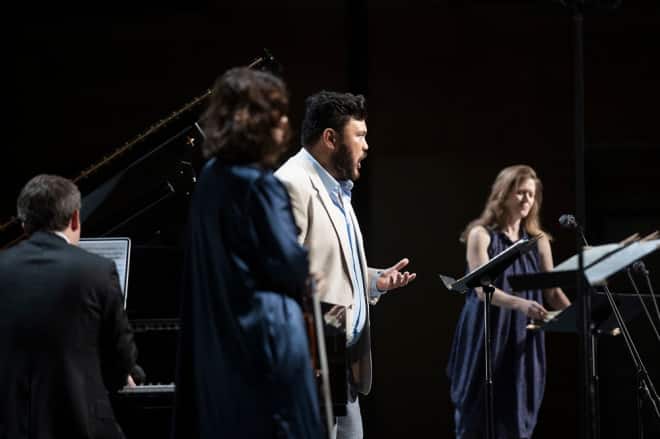 Dans ces mélodies, dont certaines répondent au désir de médiation – bien connu chez le compositeur – entre enveloppe terrestre et enveloppe céleste, d’autres dressent, plus simplement, un portrait de la vie domestique du compositeur entre sa femme et son jeune fils, la succession des atmosphères musicales, parfois romantiques, parfois dissonantes, est magnifiquement mise en valeur par la voix humaine et l’art du phrasé des deux chanteurs. Cette écriture souvent scintillante où la partie aiguë de la voix est particulièrement sollicitée (« Résurrection » !), Barbara Hannigan sait en révéler toutes les nuances, avec une intelligence du texte qui force l’admiration.