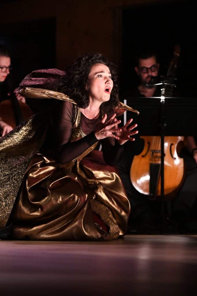 Ensuite, tout se déroule dans cette atmosphère de surprises, de contrastes, avec un grand moment lyrique, enchainant Monteverdi à Cavalli, l’extrait de l’Egisto suivant immédiatement le Lamento d’Arianna, incarné par la tragédienne drapée dans une robe princière moirée dont elle se dépouillait ensuite pour interpréter, en écho, l’autre répertoire. L’autre ? Mais il s’agit des mêmes tourments : « je meurs de tout cela et ma chanson s’arrête là… »