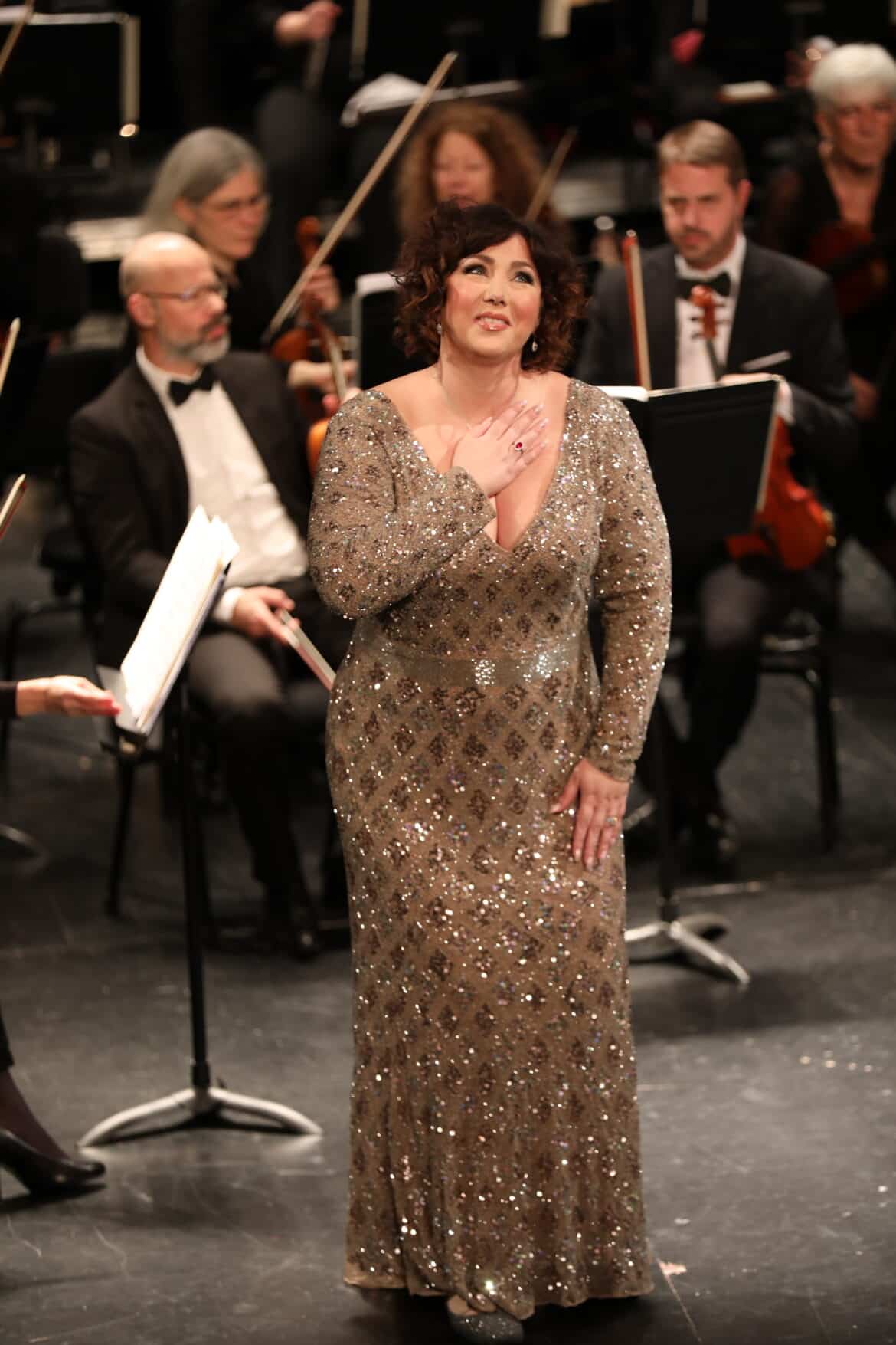 La silhouette gainée d’un fourreau rosé à sequins ou ennuagée de voiles blancs après l’entracte, Jennifer Rowley est la grande triomphatrice de la soirée et l’artiste pour laquelle le public tourangeau a le moins ménagé ses applaudissements, ponctuant régulièrement de « Brava » ses interprétations.