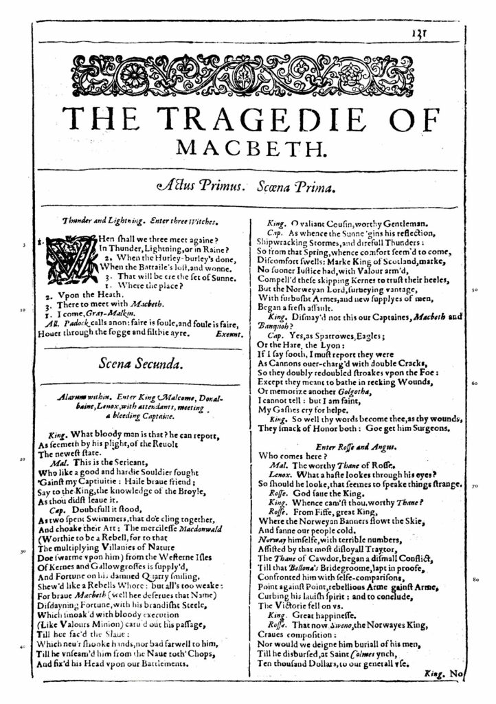 The Tragedie of Macbeth, dans le premier recueil publié des œuvres théâtrales de Shakespeare (1623)