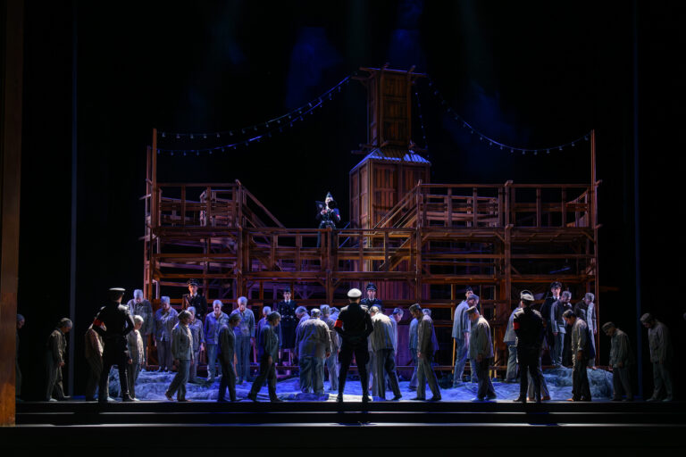 Deux strates temporelles et spatiales coexistent sur scène : une temporalité passée (la guerre) correspondant à l’horreur des camps, une temporalité « présente » (les années 60) correspondant à l’atmosphère luxueuse du paquebot. Le déroulé de l’opéra permet de passer de l’une à l’autre strate avec fluidité.