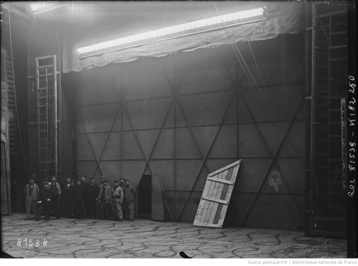 Ouvriers sur la scène de l’Opéra Comique, devant le rideau de fer