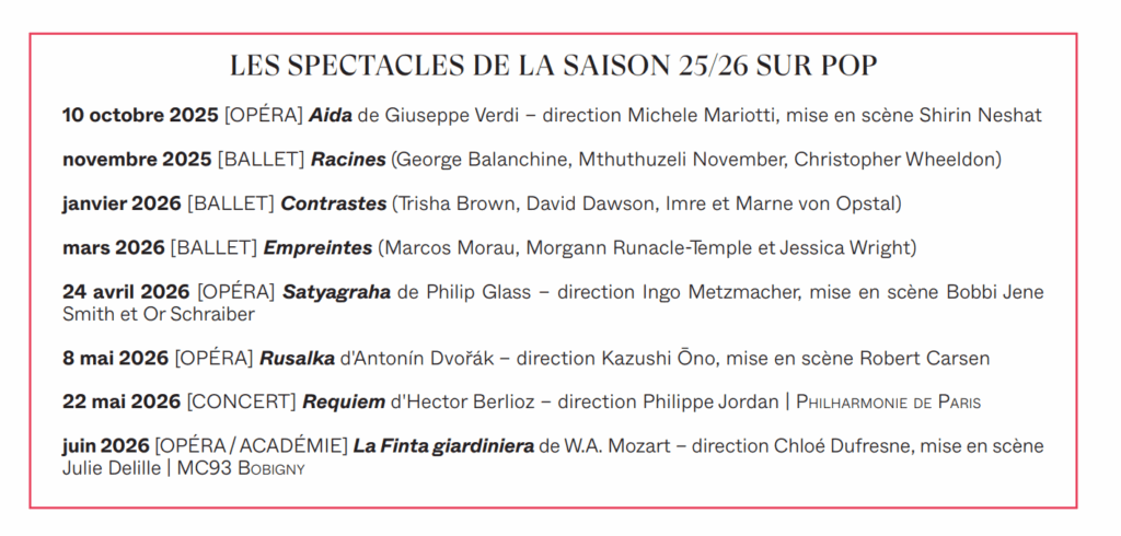 - 4 octobreNouveautés de Paris Opera Play (POP), la plateforme de streaming de l’Opéra de Paris pour cette rentrée 2025 :Opéras et ballets, en direct ou en différé : cette saison, sept spectacles (dont six nouvelles productions), et un concert symphonique seront filmés et diffusés en exclusivité sur la plateforme de streaming de l’Opéra de Paris.Une toute nouvelle série documentaire débutera également au mois de novembre : Rêver, danser, ensemble qui a suivi la première promotion du Junior Ballet de l’Opéra de Paris.Plus tard dans la saison, POP dévoilera des masterclasses d’Etoiles autour de Casse-Noisette de Noureev, ainsi qu’une série en 7 épisodes sur les coulisses de l’Opéra de Paris…