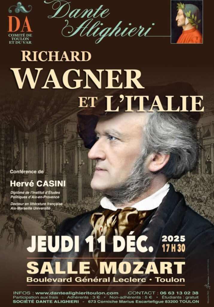 Jeudi 11 décembre, à 17h30, notre collaborateur Hervé Casini donnera une conférence intitulée RICHARD WAGNER ET L’ITALIE salle Mozart à Toulon. Informations ci-contre !