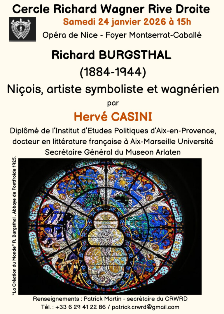 Notre confrère Hervé Casini donnera samedi prochain une conférence consacrée à Richard Burgsthal au Foyer Montserrat Caballé de l’Opéra de Nice. Toutes les informations… ci-contre !