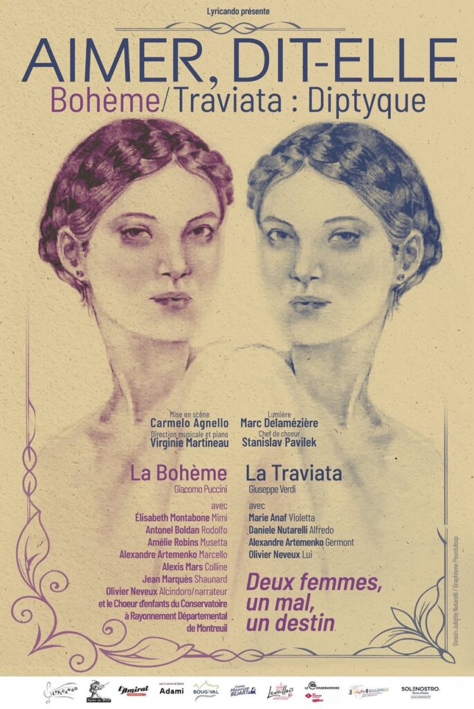 La compagnie Lyricando naît en 2024 de la passion pour l’art lyrique partagée au sein d’un groupe de musiciens professionnels décidés à mettre ensemble leurs compétences, leur expérience et leurs sensibilités au service de l’opéra. Elle propose, du 02 au 19 avril, un diptyque intitulé « Aimer, dit-elle », au cours duquel seront proposés les deux chefs-d’œuvre de Verdi et Puccini : La traviata et La bohème. Les spectacles auront lieu au Théâtre de l’Épée de bois, à la Cartoucherie de Vincennes.