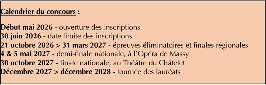 Les épreuves s’étalent sur une année, les éliminatoires débutant en octobre 2026 et la finale se tenant en octobre 2027 à l’Opéra-Comique.