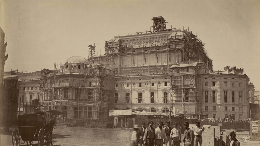 Les travaux du Palais Garnier s’étendirent sur près de quinze ans, ralentis par la guerre franco-prussienne de 1870 et par les difficultés liées au terrain marécageux. Le bâtiment fut finalement inauguré en 1875 sous la Troisième République.