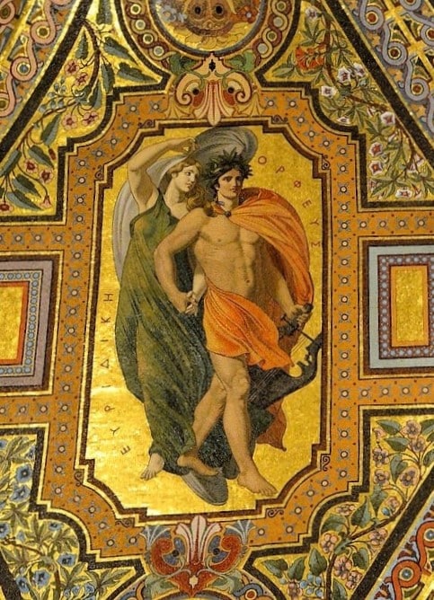 Autre personnage mythologique plusieurs fois représenté (trois fois sauf erreur : sur une mosaïque de l’avant foyer et dans deux peintures du foyer) : Orphée, chantre de la poésie lyrique dont la légende fournit la trame de deux des premiers opéras qui nous soient parvenus (l’Euridice de Peri et l’Orfeo de Monteverdi).
