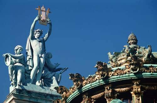 Le Palais Garnier impressionne par son style éclectique, mêlant baroque, classicisme et Renaissance. Apollon (dieu du soleil et de la lumière mais aussi des arts, de la beauté, de la musique, du chant, de la poésie) et sa lyre y sont représentés à maints endroits, à commencer par la célèbre sculpture d’ Aimé Millet qui orne la toiture de l’opéra.