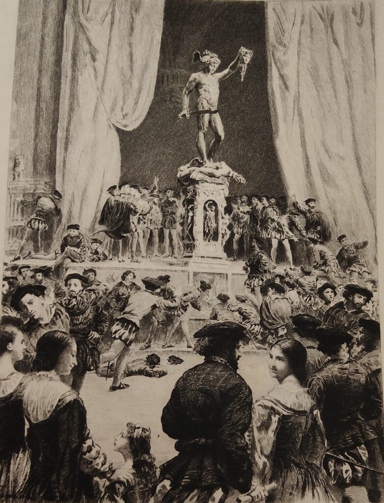 Le lendemain […], je découvris mon Persée. […] Dès qu’on le vit, il s’éleva en sa faveur, grâce à Dieu, un tel concert de louanges, que cela me consola un peu. La foule se pressa autour de la porte, que j’avais garnie d’une tenture, et le jour même où je la laissai ouverte pendant quelques heures, on y attacha plus de vingt sonnets qui tous renfermaient les plus grands éloges. Lorsque j’eus de nouveau caché la statue au regard du public, il ne se passa pas de jour sans que les doctes professeurs des écoles de Pise et les étudiants qui étaient alors en vacances y affichassent quantité de sonnets et de vers grecs et latins. Mais ce qui me flatta le plus et me donna lieu d’espérer que le duc me rendrait plus de justice, ce fut de voir les gens de l’art, c’est-à-dire les peintres et les sculpteurs, lutter entre eux à qui me vanterait le plus.